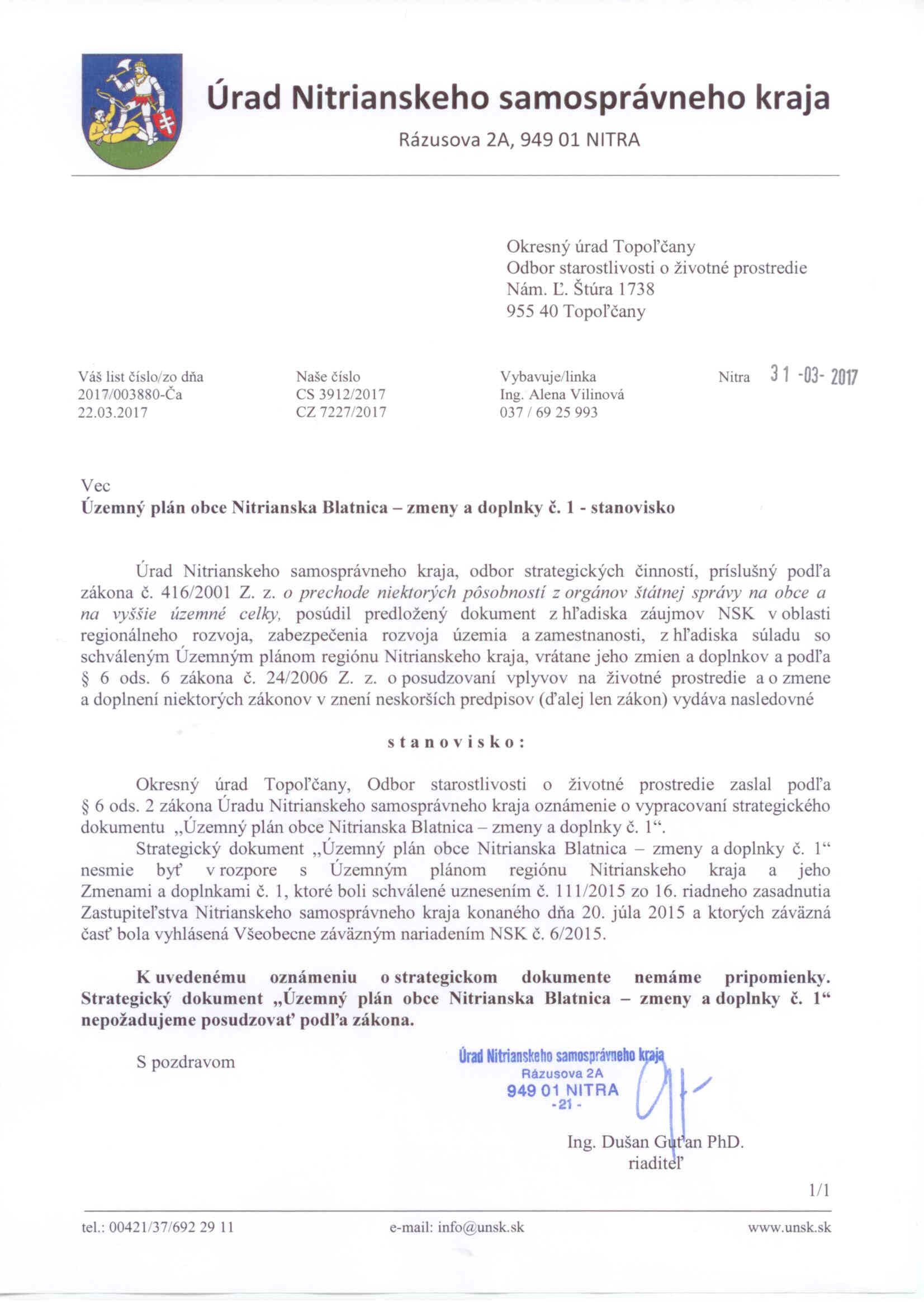 ÚPNO Nitrianska Blatnica - zmeny a doplnky č.1_stanovisko UNSK.jpg (z dňa 3.4.2017, veľkosť 218 kB, Stanoviská dotknutých orgánov - Oznámenie /S/, zobraz)