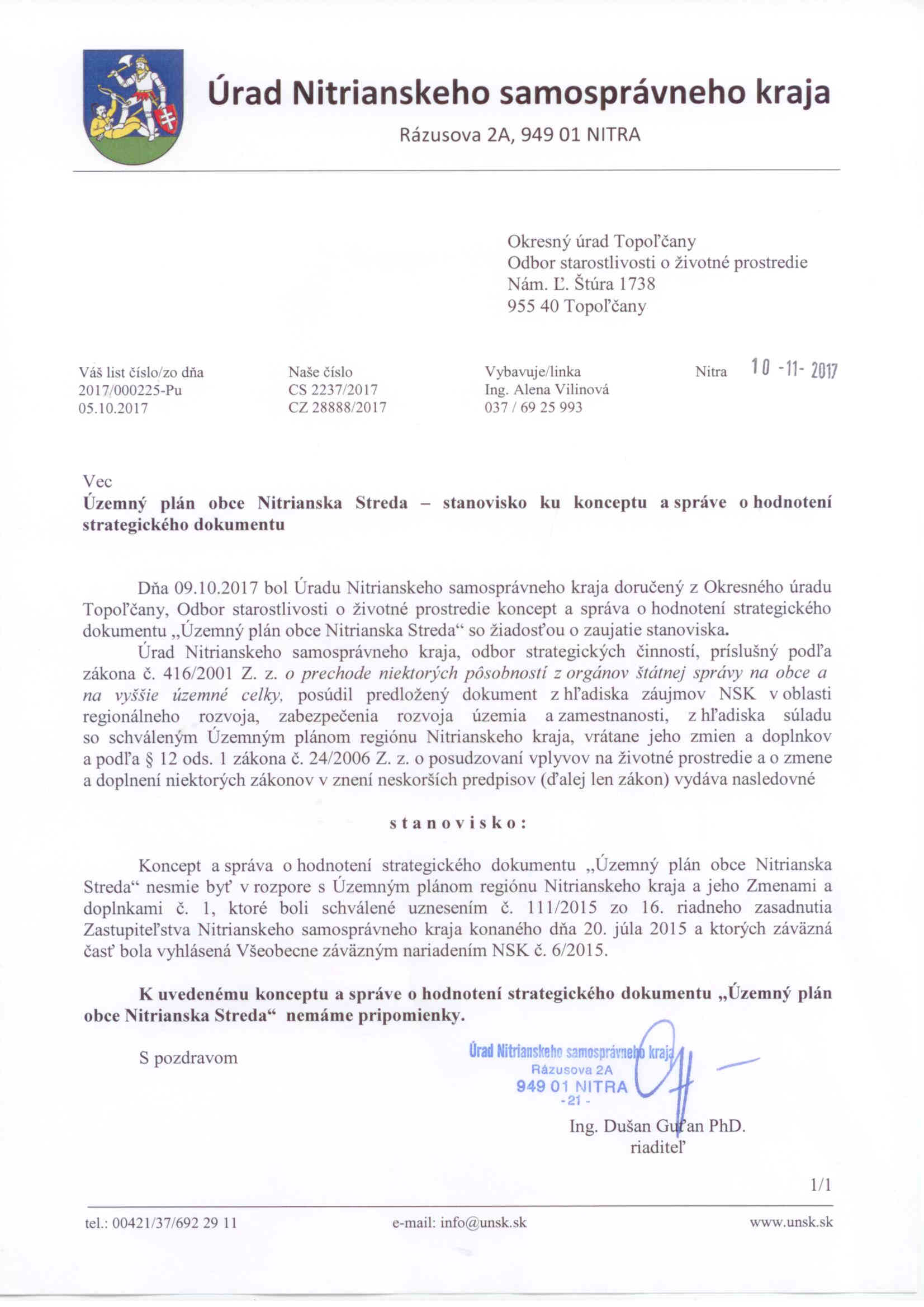 Územný plán obce Nitrianksa Streda-stanovisko OO.pdf (z dňa 10.10.2017, veľkosť 220 kB, Stanoviská dotknutých orgánov - Správa /S/, zobraz)