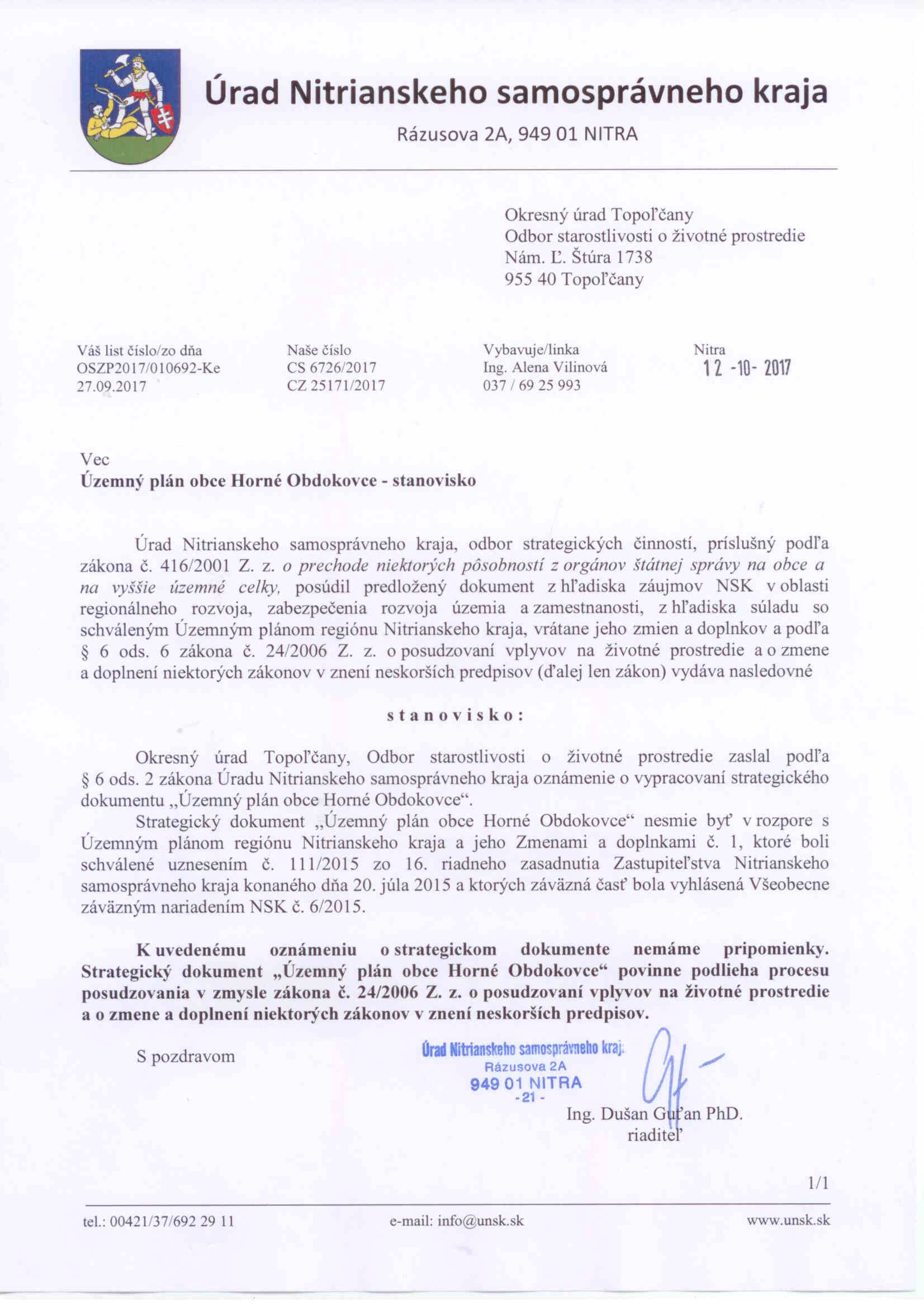 ÚPNO Horné Obdokovce_stanovisko UNSK.jpg (z dňa 23.10.2017, veľkosť 224 kB, Stanoviská dotknutých orgánov - Oznámenie /S/, zobraz)